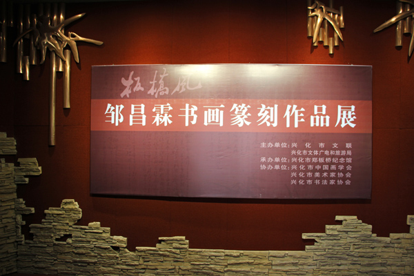 本次展览作为第十四届中国·兴化郑板桥艺术节重要活动项目之一,共展出郑板桥书画传承人邹昌霖先生精品力作50余幅,其中涵盖有书法、国画、篆刻、紫陶、紫砂、留青竹刻等作品类,具有较高的艺术价值和观赏价值。 邹昌霖,字雨亭、1966年生,江苏省书法家协会会员。泰州市美术家协会会员,泰州市花鸟画研究会理事、泰州市中国画学会理事、兴化市中国画学会副秘书长、扬州八怪书画院特聘画家,兴化市书法院副院长,第十二届兴化市政协委员,第十三届兴化市政协常委。作品多次参加省市书画展览并多次获奖,先后在扬州个园、扬州瘦西湖、福建厦门成功举办个人书画展览、报纸、电台多次作过专题报导,所画兰竹石图长期陈列于兴化郑板桥纪念馆,河南省范县郑板桥纪念馆,作品还被日本、韩国、台湾等国家和地区的友人收藏。