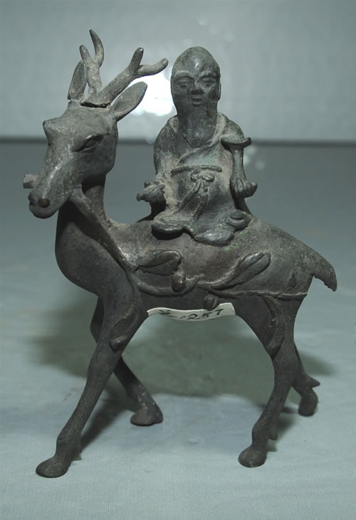 此铜器为一寿星侧骑在一只富有灵气梅花鹿上,颇为生动,题材有吉祥之意。