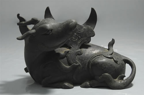牛背上有一对月牙及云纹型的铜架子,作搁镜之用,其造型生动,堪称巧夺天工。犀牛蹲伏回首而望,后仰靠圆月,前衬以镂雕云纹,意境如画。