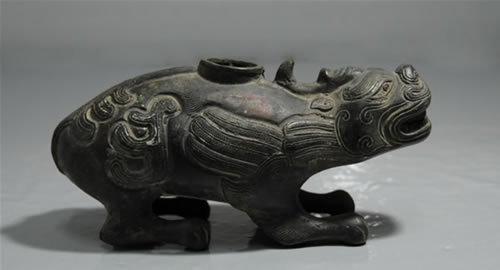 铜器为一瑞兽。四足坐卧,眼睛正视,张口呈吼状。给人威严、肃立之感。