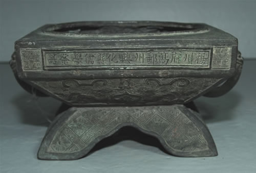炉圆口,从上看呈四方形,直壁,胫部斜收,四方形底。口沿下两边有铭文:“扬州府高邮州兴化县儒学祭器 万历乙酉知县事武林凌登瀛制”。器物双耳雕刻象鼻,底足四面装饰布纹。造型古朴、典雅。