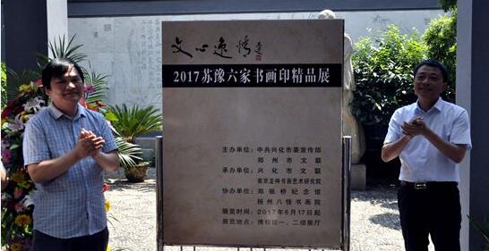 由兴化市委宣传部、郑州市文联主办,兴化市文联、南京龙神书画艺术研究院承办、郑板桥纪念馆与扬州八怪书画院协办的“文心逸情——2017苏豫六家书画印精品展”于6月17日在市博物馆开幕。开幕式由副市长王进主持,副市长丁春华、嘉宾龚洪林分别致辞,市委常委、宣传部长刘春龙和郑州市文联主席钟海涛为开幕式揭牌。本次展览展出苏豫两省六位书画名家精心创作的精品力作90件,令兴化书画同仁大开眼界。