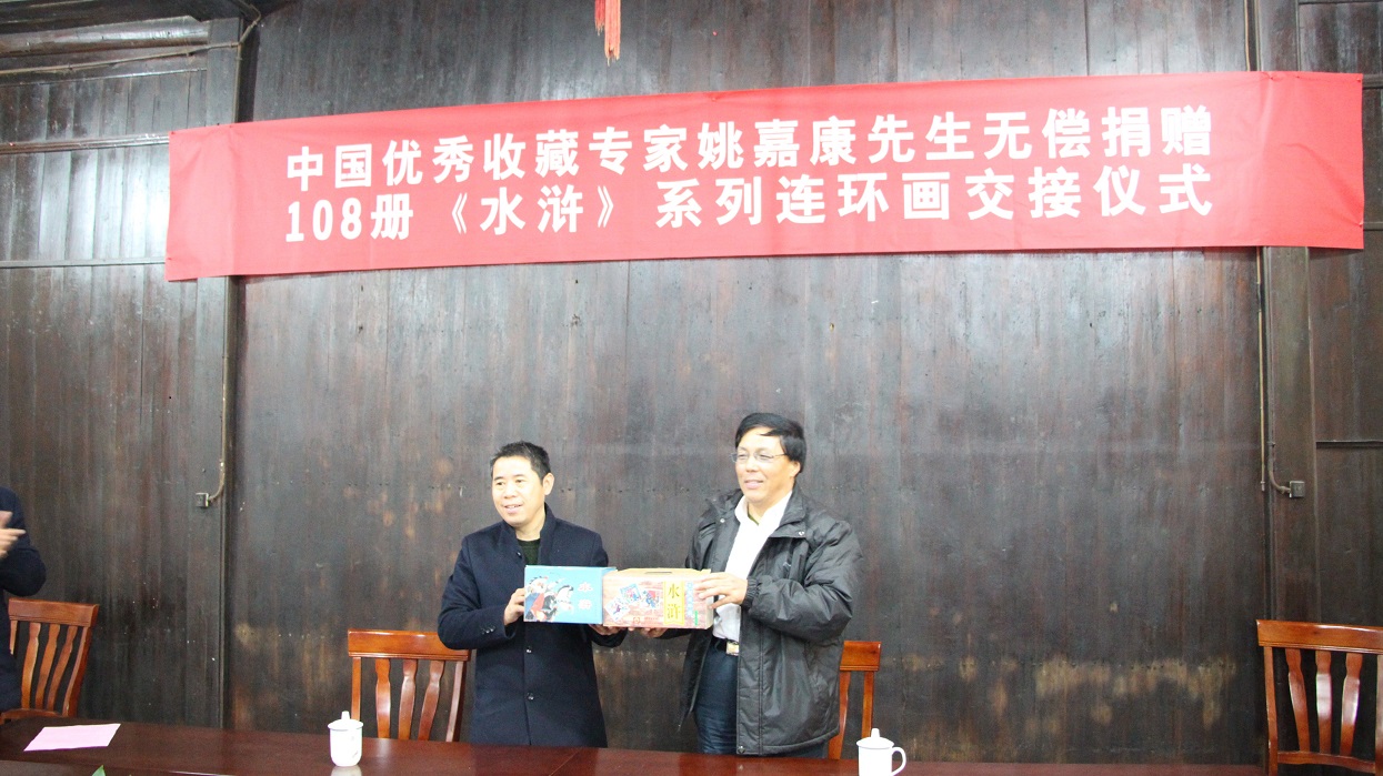 11月25日上午,在李园松云山馆举行了“中国优秀收藏专家姚嘉康先生无偿捐赠108册《水浒》系列连环画交接仪式”。