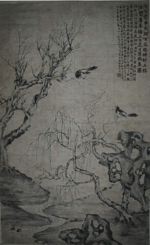 其作品为设色写意喜鹊登梅图轴。图绘百花魁畔,三阳开泰之季,两只喜鹊栖于枝头,相互对望,柳、石用笔刚劲,鸟羽笔触轻柔,流水蜿蜒不息。