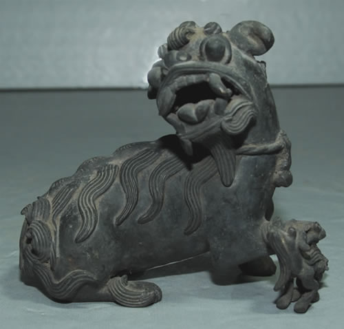 此铜器为一头狮子,张口吼叫,眼睛注视前方,右脚嬉玩,生动活泼。